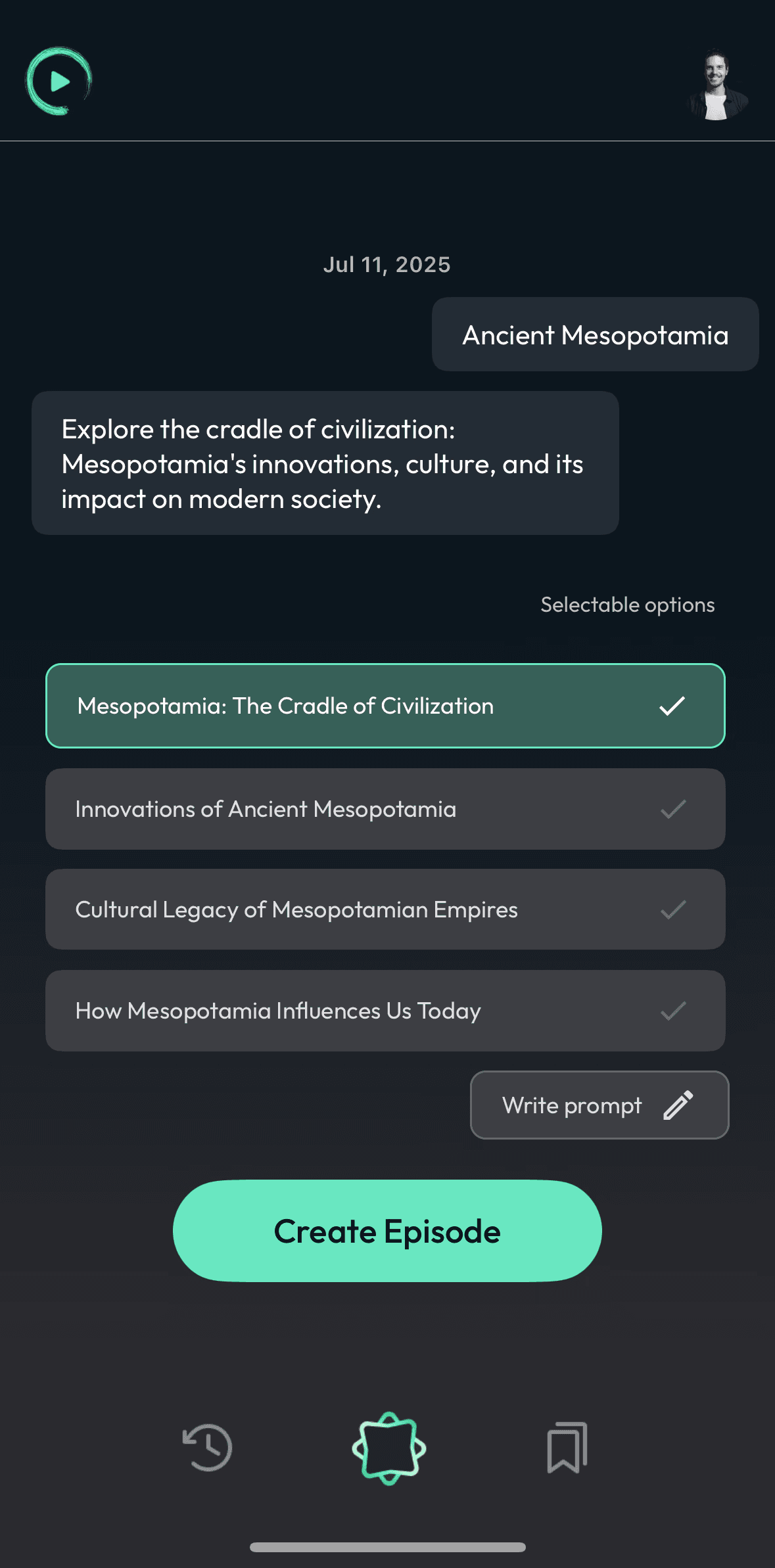 Your curiosity, your voice, your topic. Every episode is custom-made — in seconds.